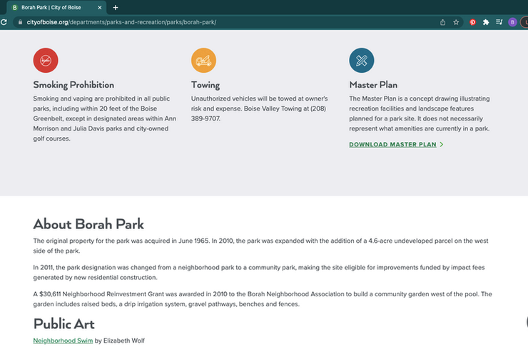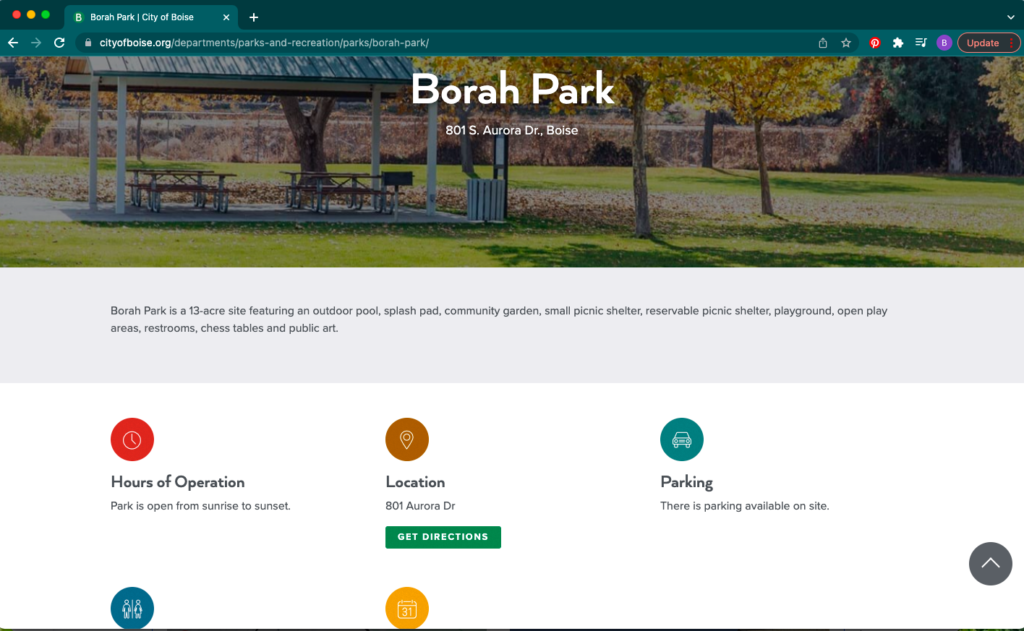 Once you click on a specific park, it pops up with all of the important details – description, hours, location, parking, features and amenities, etc. Click through the screenshots below of Borah Park to give you an example: