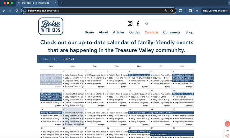 You won’t have to drive too far to get to one of our many local libraries. Go to your local favorite or do a little “Tour de Libraries” and check them all out! They’ve each got wonderful story times and other events happening this summer throughout each day. Most also have a great kids area where the kiddos can explore and play with toys and participate in other learning activities. We especially love the Children’s area of the Eagle library and that the Garden City library’s tagline is that they are “not a quiet library!”