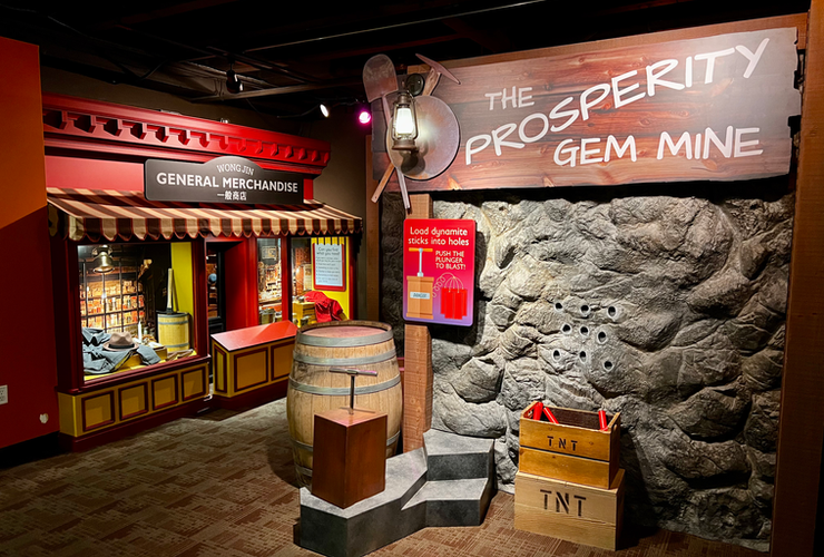 Next to the big train was my favorite section – The “Prosperity Gem Mine.” There’s a section of stone wall where kids can insert pretend sticks of dynamite into holes then push down the plunger to cause an “explosion!” There’s a big BOOM and the dynamite pieces fall out.