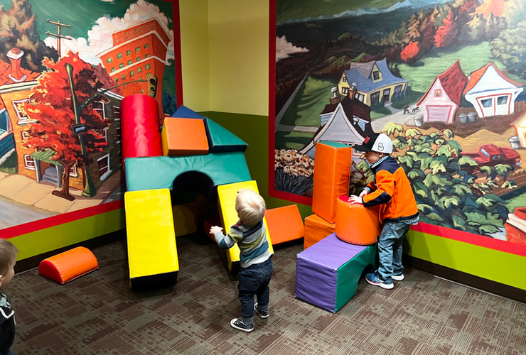 There’s a really fun section where you can use a bunch of cool wooden pieces to plan your own town. Also a big space to use giant foam building blocks to build up towers, forts, etc. I bet our boys could have played in these two little rooms for hours—and we were just getting started!